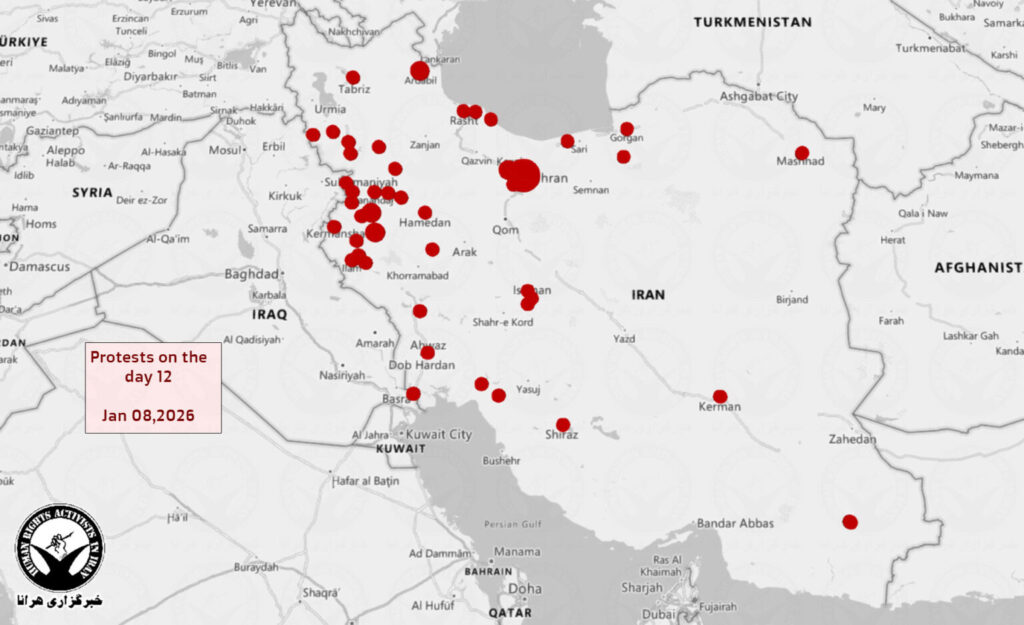 HRANA – Nationwide protests in Iran continued on their twelfth day, Thursday, January 8, 2026, according to reports collected by HRANA. Demonstrations and protest actions were recorded in at least 46 cities across 21 provinces. At the same time, a wave of strikes and market closures was reported, particularly in Kurdish regions, with dozens of cities in Kurdistan, West Azerbaijan, Kermanshah, and Ilam provinces joining the strikes.