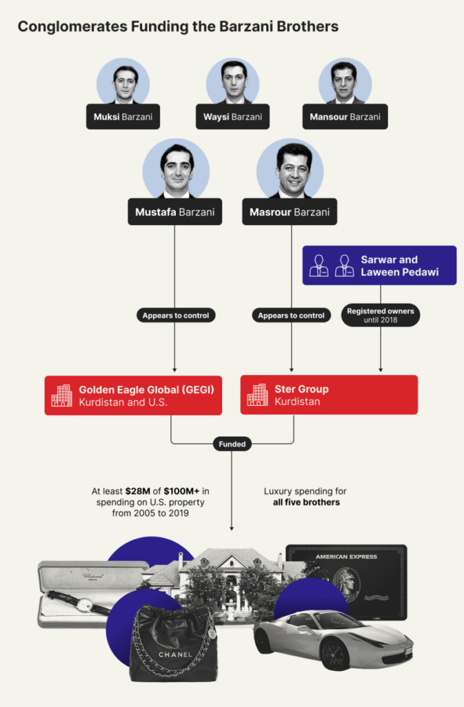 More than $10 million used for these purchases originated from Golden Eagle Global, an Iraqi Kurdish conglomerate that leaked documents suggest was controlled by Mustafa Barzani, the youngest of the brothers.