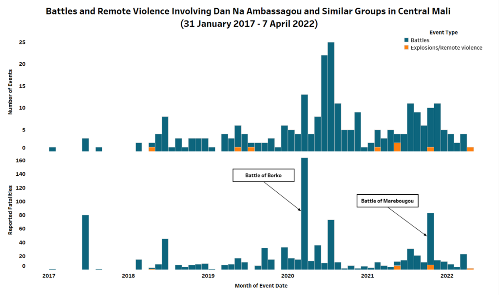 JNIM’s increasing military campaigns against Dan Na Ambassagou, and in Le Pays Dogon in general, have been observed since late 2019 and continued largely unimpeded until late 2021. During this period, Dan Na Ambassagou and Donso militiamen suffered significant losses among the deadliest armed clashes ever recorded by ACLED in Mali. In March 2020, a major battle in Borko village resulted in over 100 reported militiamen fatalities (see graph below). In October 2021, Dan Na Ambassagou and Donso militiamen joined forces in a failed attempt to lift a JNIM blockade on the village of Marebougou, resulting in at least 50 reported fatalities. Amid JNIM’s continued pressure on the movement, Dan Na Ambassagou’s leader, Toloba, has been particularly outspoken about the Malian military’s disengagement in the Mopti region in recent years (Bamada, 2 October 2020; aBamako, 18 December 2020).