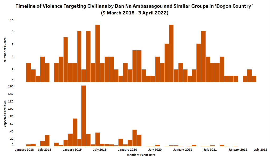 Dan Na Ambassagou is the main ethnic Dogon-majority militia and the umbrella organization of Dogon militias in ‘Dogon Country’. Over time, ACLED has coded events that may or may not be associated with the group Dan Na Ambassagou as Dogon Ethnic Militia (Mali) and Dozo Communal Militia (Mali). These coding designations are made based on reports that often do not mention the group’s name or use the collective terms ‘chasseurs’ or ‘Dozos’ (hunters). The lack of detailed reports also creates confusion about the various groups and their affiliation or non-affiliation with Dan Na Ambassagou. Therefore, the data in this report is based on what is collectively referred to as ‘Dan Na Ambassagou and similar groups.’