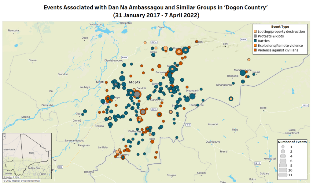 Dan Na Ambassagou relies on the Dogon community for recruitment, funding, and support (RESOLVE, November 2021). Members of the Dogon community who oppose or undermine Dan Na Ambassagou’s authority are routinely intimidated or attacked. Dan Na Ambassagou has targeted Dogon communities by extorting, abducting, and killing villagers in Bandiagara, Bankass, Douentza, and Koro in the Mopti region; particularly those who refuse to comply with demands for money and recruits or who have agreed to peace agreements with Fulani communities. At the same time, JNIM, has carried out both violent and nonviolent actions against Dogon communities, simultaneously coercing and posing as a mediator and guarantor of peace agreements between Fulani and Dogon communities. Through these actions, JNIM has undermined both Dan Na Ambassagou’s influence and the state forces present in the region. Dan Na Ambassagou maintains strong influence in its traditional stronghold throughout Mopti region, including: on the cliffs of Bandiagara; in the major towns Bandiagara, Bankass, and Douentza; and in the vicinity of these towns. The group frequently runs checkpoints, extorts road users, and abducts people on sections of major transit routes, principally between Bandiagara and Mopti and between Douentza and Konna. However, the group’s influence has waned considerably, particularly in the Seno-Gondo plain, where JNIM and its affiliates conduct sustained military campaigns and engage in peace agreements with communities to assert control.