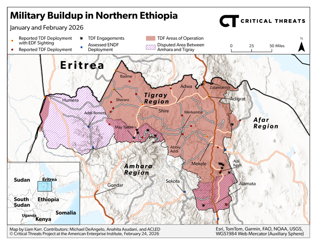 The TPLF and Eritrea have bolstered ties amid their deteriorating relations with the federal government. Eritrean President Isaias Afwerki and TPLF officials reportedly met in January 2025 in one of several meetings between Eritrean and TPLF officials.[xl] Afwerki pledged to support the TPLF in case of a war with Ethiopia, according to French outlet Africa Intelligence.[xli] Eritrea and Tigray reopened a border crossing in June with TPLF head Debretsion in attendance, and Debretsion declared the TPLF’s intention to strengthen relations with Eritrea afterward.[xlii] Eritrea may have provided intelligence support for the TPLF’s de facto coup against the TIA in March and the TDF’s recent offensives in northwestern and southern Tigray, according to The Guardian and the Belgium-based, human rights-focused Europe External Programme with Africa think tank, respectively.[xliii] Eritrea has deployed forces to the Tigray border, with multiple sources reporting that Eritrea has deployed forces in Tigray itself.[xliv] An Ethiopian military official told French outlet The Africa Report on February 11 that Eritrean forces have established positions along key roads.[xlv] The TPLF denied ongoing military coordination with Eritrea but left open the possibility of an alliance in a conflict against Ethiopia.[xlvi]