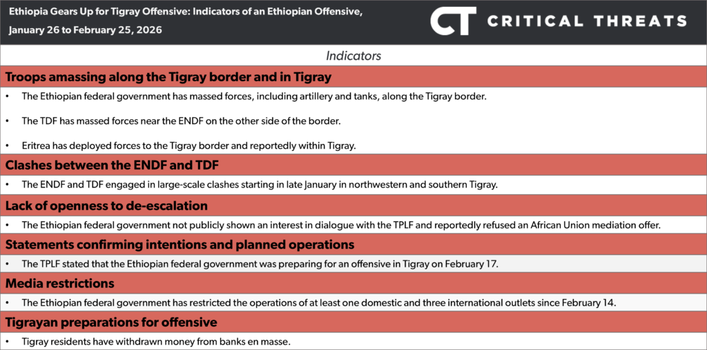 The Ethiopian federal government will likely launch an offensive against the Tigray People’s Liberation Front (TPLF) within the next month. The Ethiopian National Defense Force (ENDF) has massed forces and equipment at multiple locations along the Tigray regional border.[i] Videos on social media show convoys transporting heavy artillery, tanks, and troops toward Tigray.[ii] The ENDF has redeployed forces from across the country toward Tigray, including units stationed in Amhara and Oromia—two regions facing insurgencies from other armed groups.[iii] The ENDF has also declared a mobilization of former soldiers.[iv] TPLF head Debretsion Gebremichael said on February 17 that the ENDF is preparing to launch a war in Tigray, and the TPLF has since warned the international community of the risk of war.[v]