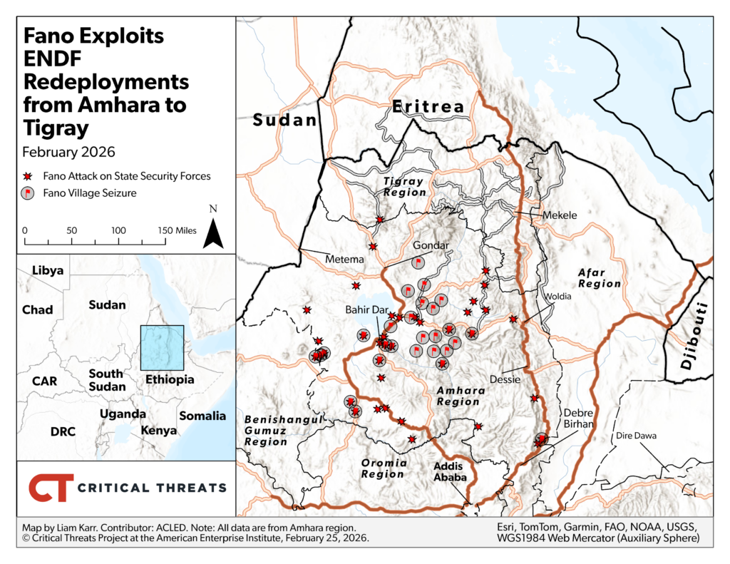 The ENDF’s redeployments from Amhara have left gaps for Fano and the OLA to exploit. Fano has launched offensives in central and western Amhara, capturing several towns along key roads.[lix] Fano captured Debre-Tabor—located on the main B22 highway connecting eastern and western Amhara—on February 8.[lx] Fano then captured Wereta—located on the A3 highway connecting Bahir Dar and Gondar, the two largest cities in Amhara—on February 15.[lxi] The ENDF has since conducted drone strikes and mounted ground operations to clear Fano positions, but clashes are ongoing.[lxii] Fano has briefly contested major cities in the past and had the most active three-month stretch of its insurgency ever from August to October 2025.[lxiii] The OLA may also exploit the ENDF’s redeployments from Oromia and surrounding regions, as it has reportedly captured territory in Beninshagul-Gumuz region since the redeployments.[lxiv] The OLA is active across central, southern, and western Ethiopia, including near Addis Ababa, the Ethiopian capital.[lxv]