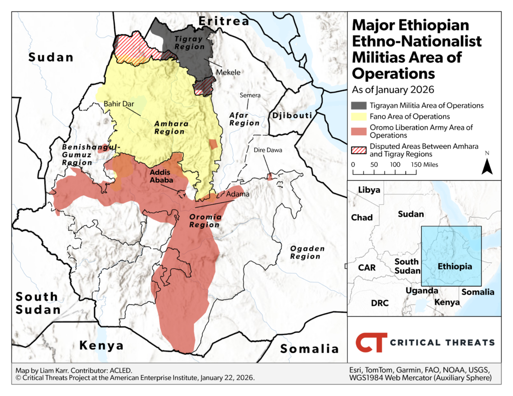 The Ethiopian federal government likely seeks to neutralize the TPLF and its role in an emerging anti-Ethiopian federal government coalition consisting of Eritrea, the TPLF, Amhara ethno-nationalist Fano militias, and potentially the Oromo Liberation Army (OLA). The TPLF has opposed Ethiopian Prime Minister Abiy Ahmed’s plan to transition from a region-centric system of ethnic federalism to a more centralized and powerful federal government since he took office in 2018.[xxxii] These fundamental disputes sparked the Tigray war in 2020.[xxxiii] Abiy has since been unable to uproot the TPLF’s hold on military and political power in Tigray despite the Pretoria agreement mandating federal control of the region.[xxxiv] ENDF head Birhanu Jula stated in late 2025 that the TPLF’s violations of the Pretoria agreement justify war and that someone must depose the TPLF leadership.[xxxv] Tadesse has denied recent rumors that the ENDF deputy head said that the ENDF would seize all military bases in Tigray, but the TPLF has said that the Ethiopian federal government is preparing for war, with potential ENDF buildups on the Afar border near Mekele, the Tigray capital.[xxxvi]