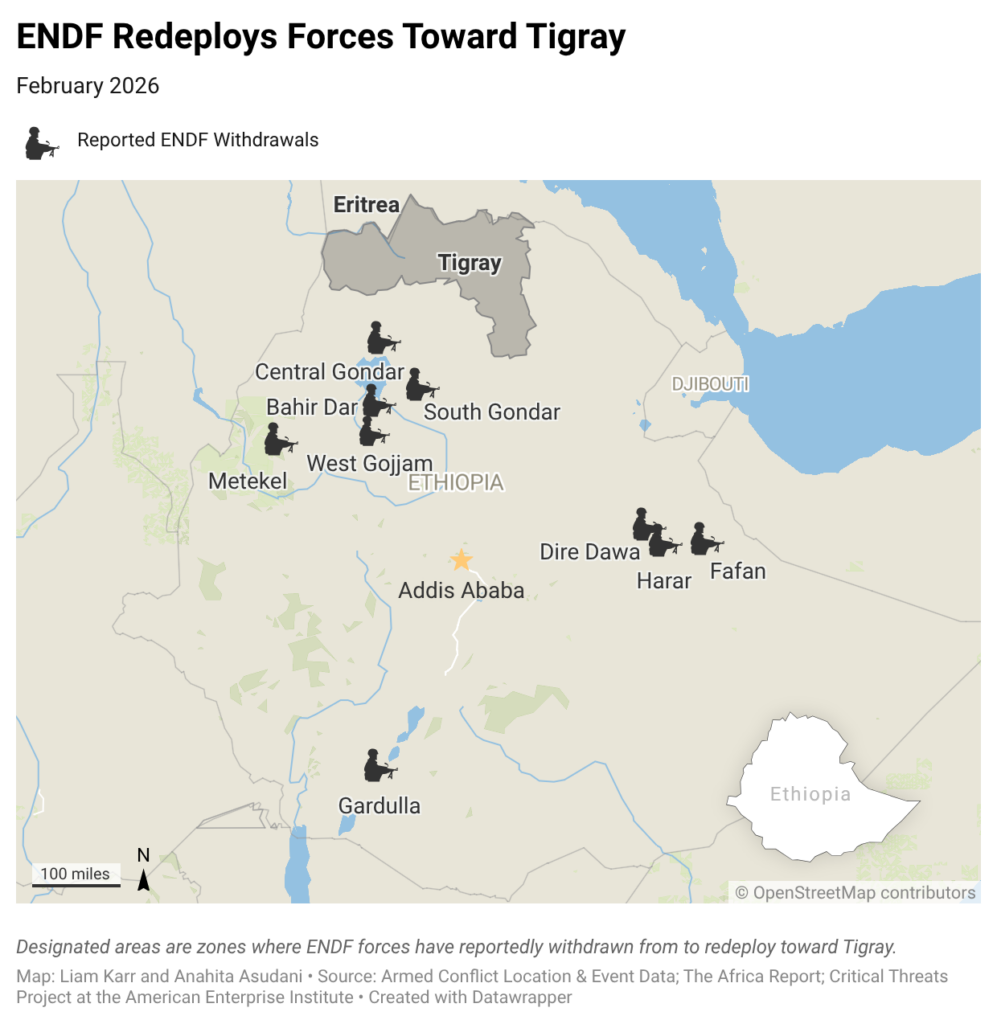The federal government and TPLF took increasingly belligerent stances throughout the rest of 2025 that pushed both sides toward open confrontation.[xxvi] The TPLF reinstated a central military command in June, which gives the TPLF formal control over the TDF.[xxvii] The TDF conducted raids in Afar, whose regional government is aligned with the federal government, in November to degrade the Tigray Peace Forces—an anti-TPLF Tigrayan faction that the TPLF accuses the federal government of backing.[xxviii] The ENDF responded with a drone strike on TDF positions, its first strike on Tigrayan forces since the end of the Tigray war.[xxix] The federal government then halted funding to Tigray in December, contributing to a limited TDF revolt against Tigray’s regional administration over unpaid salaries.[xxx] The TPLF has also accused the federal government of imposing a fuel blockade on Tigray.[xxxi]
