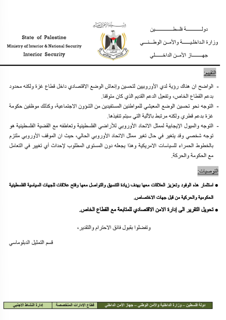 “The positive approach and inclinations of the EU representative to the Palestinian territories and his sympathy with the Palestinian cause are a personal approach, and this might change when the current EU representative changes, since the European position is committed to the red lines of American policies,” the document reads.