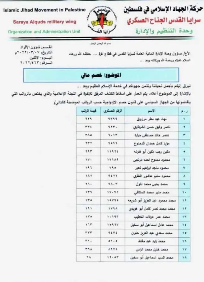 Salama was allegedly a member of the Islamic Jihad working as the deputy chief of its propaganda team in Shaboura. Saraj was also named as an Islamic Jihad member in Bureij.
