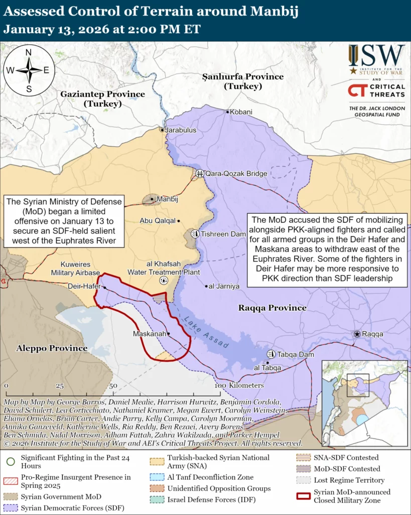 The MoD and SDF have undertaken the following lines of effort to achieve their respective objectives. The SDF reportedly destroyed three bridges near Umm Tina, Tell Maaz, and Rasm al Harmel villages to disrupt MoD advances along the northern and western flanks of the salient on January 13.[72] The 20-meter-wide al Jer canal divides most of the northern and western flanks of the Deir Hafer salient—and therefore the SDF–MoD frontlines—acting as a barrier that forces must cross to reach the opposite side.[73] Local pro-government sources claimed the SDF deployed landmines near Babiri village on January 13, likely to create a defensive barrier because Babiri and the nearby water plant are the only areas of Deir Hafer salient not bisected by the canal.[74] The SDF also reportedly deployed sniper units to Deir Hafer itself and nearby villages to halt MoD advances on January 13.[75] The SDF separately conducted a drone strike in MoD-controlled Humaymah, to which the MoD responded by conducting counter-battery artillery strikes on Deir Hafer on January 13.[76] The MoD conducted multiple drone and artillery strikes on SDF positions within the Deir Hafer salient, including strikes on Deir Hafer, Umm al Mara, and Rasm al Krum on January 13.[77] MoD drone strikes also targeted the SDF-controlled Jirah Airbase, likely to disrupt SDF efforts to reinforce its frontlines in the salient on January 13.[78] The MoD reportedly prevented the SDF from destroying the bridge that connects MoD-controlled Rasm al Imam to SDF-controlled Rasm al Krum which could allow for MoD forces to cross the al Jer canal and begin advances on Deir Hafer, as the road is the most direct northern route to Deir Hafer.[79] The MoD and SDF both deployed reinforcements to the Deir Hafer salient on January 13, with the MoD reinforcements reportedly including drone units and recently produced multiple launch rocket systems (MLRS).[80]
