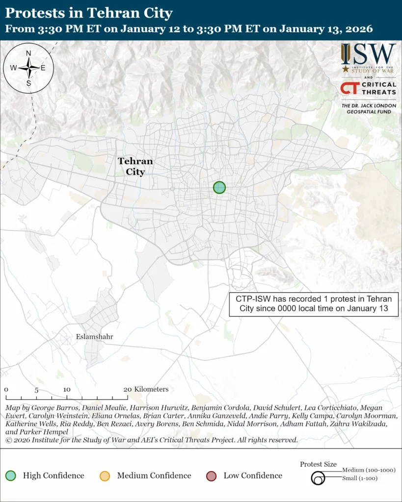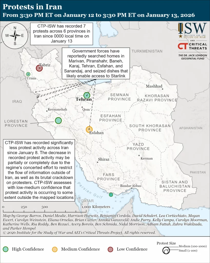 Protests in Iran: Reports of protest activity across Iran continued at a relatively low level on January 13. CTP-ISW recorded 7 protests across 6 provinces on January 13, compared to 156 protests across 27 provinces on January 8. We assess with low-to-medium confidence that protests are occurring beyond what we have recorded, however, and that the regime has successfully limited the amount of information leaving Iran.