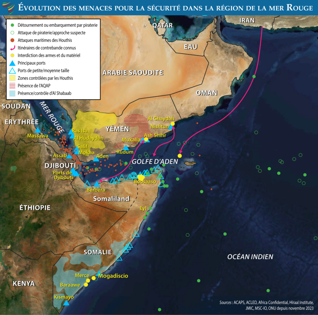 La piraterie dans la région a également connu un pic. Les activités de piraterie étaient minimes depuis 2015, et le dernier détournement a eu lieu en 2019. Cependant, depuis novembre 2023, 47 événements liés à la piraterie se sont produits dans le golfe d’Aden et l’océan Indien occidental.