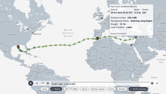 Screenshot from MarineTraffic showing the path of the Seaways Brazos.