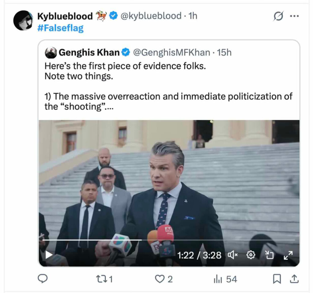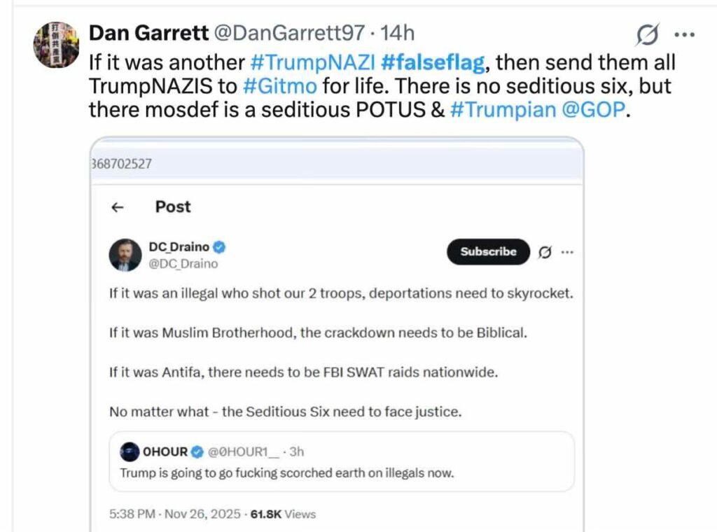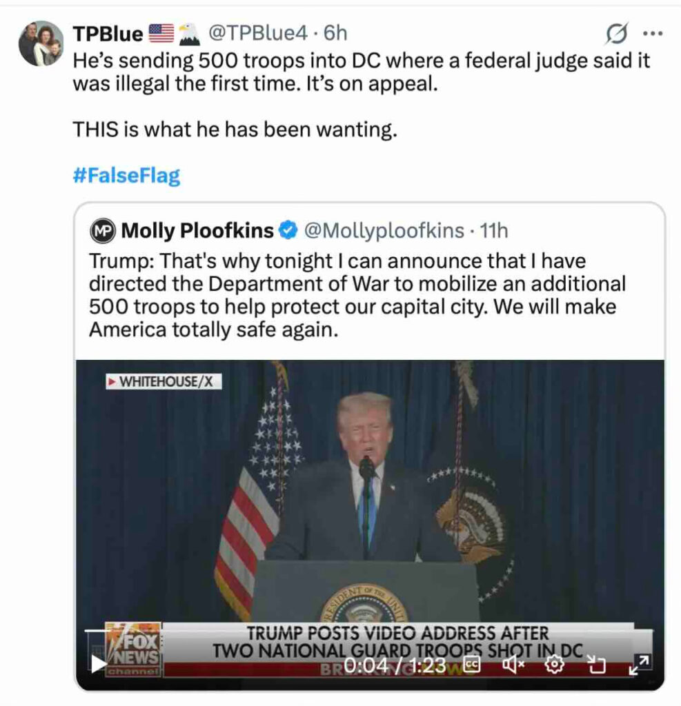 *À qui profite le crime ? Trump a qualifié l’attaque de « terrorisme », sous-entendant qu’il s’agissait d’un acte violent stratégiquement conçu contre des civils (?) dans le but d’en tirer un avantage politique. (C’est la définition même du terrorisme, une tactique militaire malheureusement trop courante à travers des millénaires d’histoire.) Mais puisque tout terrorisme est stratégique, quel était précisément l’objectif stratégique des responsables de cette fusillade ? La réponse est évidente : Trump et son programme en ont été les principaux bénéficiaires. Le président a pu discourir à tout-va la veille de Thanksgiving, qualifiant le tireur d’« animal », tout en se présentant comme le protecteur de la nation en général et de sa capitale en particulier. Son ordre d’envoyer la Garde nationale à Washington DC semble justifié par cette prétendue « attaque terroriste radicale perpétrée par un musulman afghan ». (Hegseth a utilisé l’attaque comme prétexte pour envoyer 500 gardes nationaux supplémentaires à Washington.) Et le programme anti-immigration de Trump a reçu un énorme coup de pouce, car Trump a eu un prétexte pour émettre un décret : « Le traitement de toutes les demandes d’immigration concernant les ressortissants afghans est suspendu indéfiniment en attendant un examen plus approfondi des protocoles de sécurité et de vérification. »