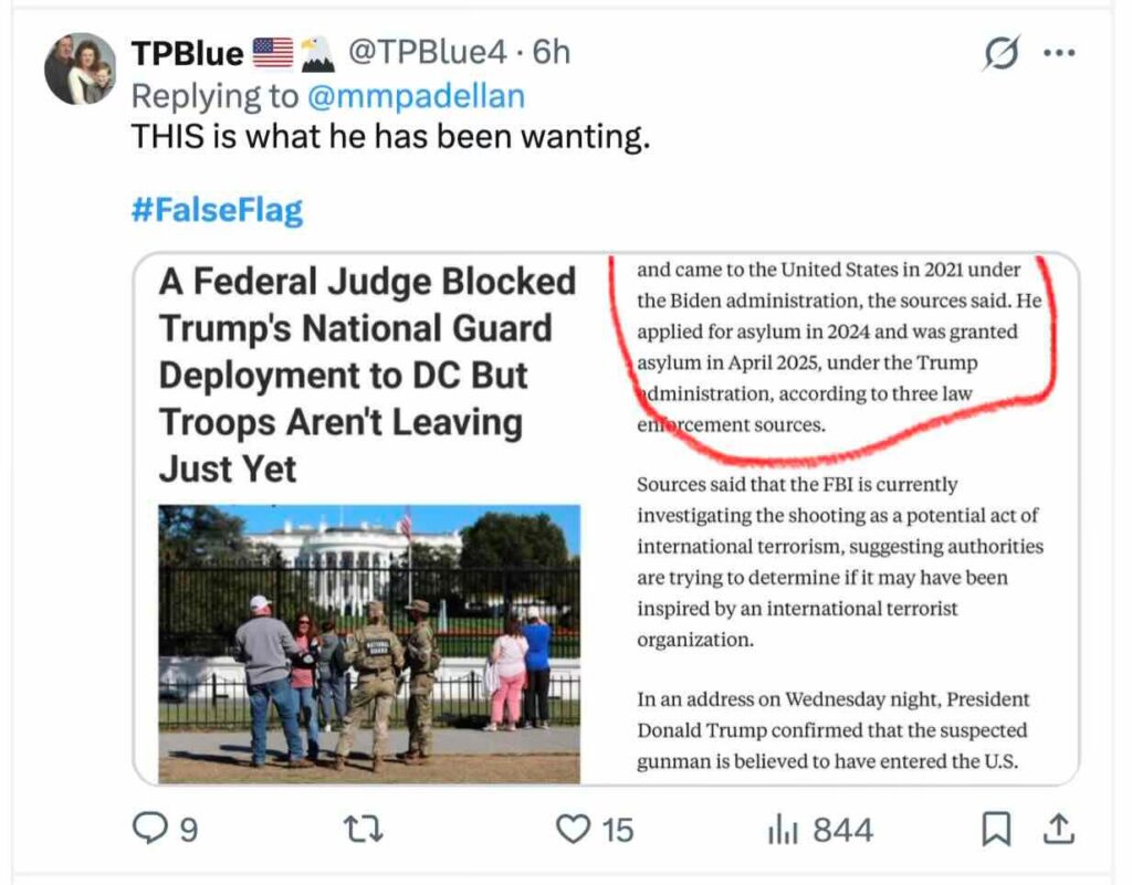 Les médias traditionnels rapportent qu’un demandeur d’asile afghan, Rahmanullah Lakanwal, a tiré sur deux membres de la Garde nationale près de la Maison-Blanche la veille de Thanksgiving. L’événement présentait de nombreux signes classiques d’une opération sous faux drapeau. En voici quelques-uns :