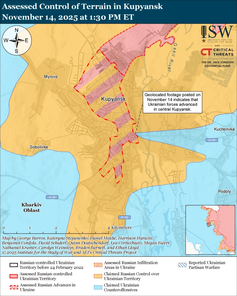 Refinement of areas under Russian claims: Geolocated footage published on November 13 and 14 indicates that Ukrainian forces maintained positions or recently advanced in central Kupyansk and east of Petropavlivka — areas where Russian sources previously claimed that Russian forces maintained a presence.[54]