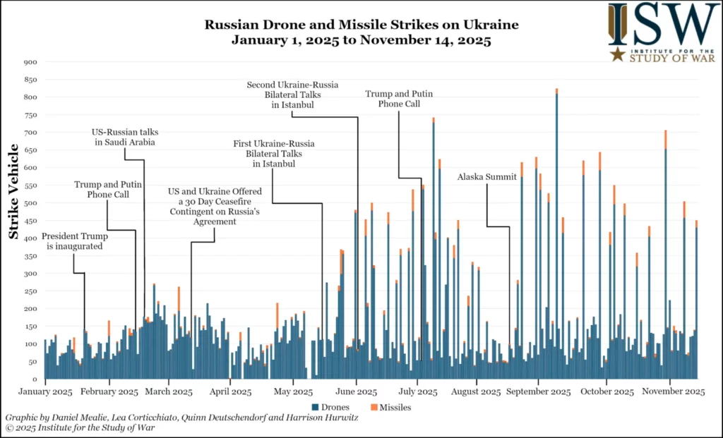 Ukrainian forces continue to enhance their air defense system against Russian strikes in ways that offer Europe and the United States valuable lessons. Ukrainian Defense Minister Denis Shmyhal announced on November 14 that Ukraine launched serial production in Ukraine of the “Octopus” interceptor drone with three manufacturers beginning immediately and 11 others preparing production lines.[18] Shmyhal noted that the interceptor drones are able to operate at night, in electronic warfare (EW) contested environments, and at low altitudes. Shmyhal reported that the Octopus can intercept Russian Shahed-type drones. Shmyhal’s announcement follows a similar announcement on October 20 about the production of the Octopus drones in the UK.[19] Business Insider reported on November 12 that European defense company Atreyd stated that it shipped its “drone wall” system to Ukraine.[20] The “drone wall” reportedly consists of a collection of first-person view (FPV) drones that launch from designated platforms if radar systems detect a threat, and the drones are arrayed in layers and spaced apart. The FPVs intercept Russian drones by detonating nearby. The system reportedly relies on artificial intelligence (AI) to operate autonomously, and one operator will be able to control 100 drones. Business Insider reported that the “drone wall” system is able to operate in GPS-denied areas as it uses pre-installed 3D maps of the area, augmenting the system’s electronic warfare (EW) resilience. The system’s drones are able to operate at various altitudes and are equipped with identification technology to prevent friendly fire. Business Insider noted that system operators will not require any specialized training nor prior drone pilot training. Atreyd noted that the system will likely be operational in Ukraine within a few weeks and that Ukraine will employ the system to defend its cities and critical infrastructure, but may deploy systems closer to the frontline to intercept Russian glide bombs later. Atreyd’s “drone wall” system is defensive in nature and notably differs from Ukraine’s tactical ”wall of drones” concept, which uses a large number of tactical strike drones and loitering munitions to destroy manpower and equipment on the frontline.[21] Europe can glean important lessons from Ukraine’s air defense measures, including its future employment of Atreyd’s system, to understand how innovations in tactics and technology can counter Russia’s evolving aerial threats. ISW continues to assess that the West should support Ukraine’s interceptor drone program not only for Ukraine’s defense against Russian strikes but also for the defense of Europe.[22]