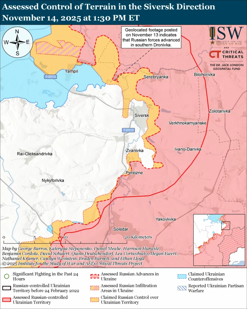 Russian forces continue to advance within the pocket in the Pokrovsk direction. Geolocated footage published on November 13 and 14 indicates that Russian forces recently advanced in northern and eastern Pokrovsk and in southern Myrnohrad.[3] Additional geolocated footage published on November 14 indicates that Russian forces recently conducted infiltration operations in southeastern Pokrovsk.[4] Pokrovsk itself remains contested, however, and Ukrainian forces continue to hold positions within the settlement. Geolocated footage published on November 14 indicates that Ukrainian forces maintain positions or recently advanced in northern Pokrovsk, contrary to Russian claims of Russian advances.[5] Geolocated footage published on November 14 indicates that both Ukrainian and Russian forces hold positions in northern Pokrovsk.[6] Russian milbloggers acknowledged that Russian forces do not control all of the town and that there is fighting ongoing in northern and eastern Pokrovsk.[7]