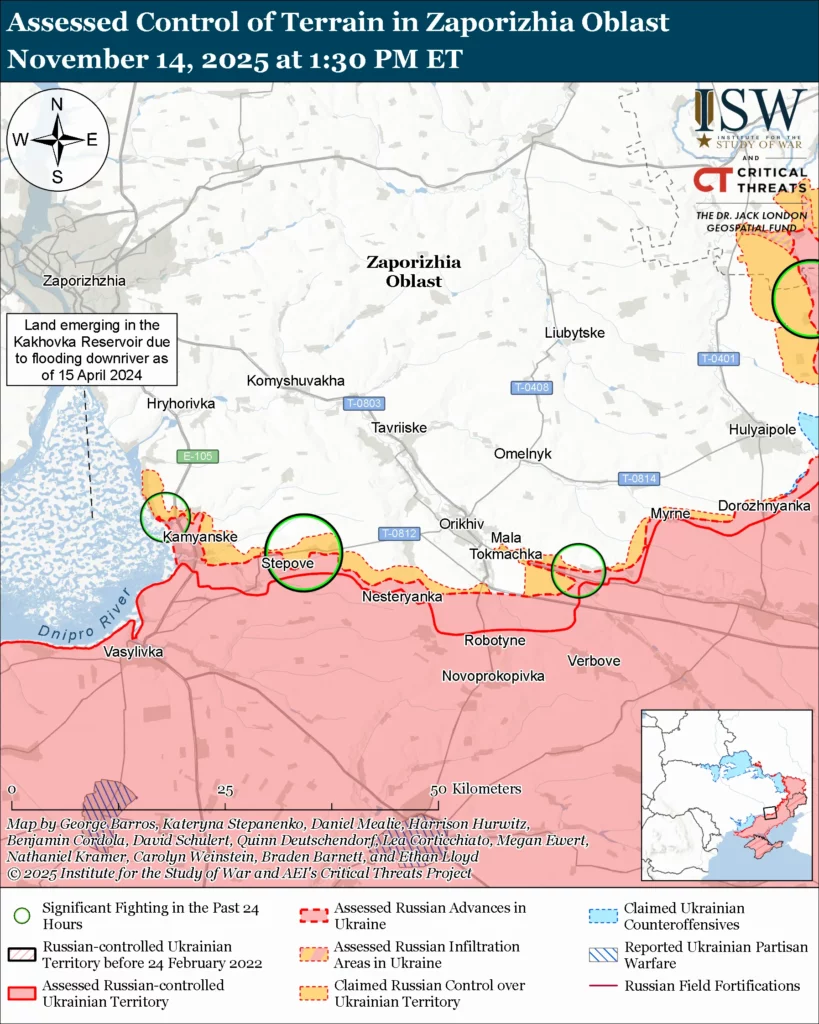 Ukrainian forces continue efforts to prevent Russian advances on the northern shoulder of the pocket. Additional geolocated footage published on November 14 indicates that Russian forces seized Novotoretske and advanced in central Boikivka (both northeast of Pokrovsk).[8] Ukraine’s Special Operations Forces (SSO) reported on November 14 that Ukrainian forces conducted a drone strike against a concentration of Russian servicemembers of the 1st Slovyansk Motorized Rifle Brigade and 9th Motorized Rifle Brigade (both of the 51st CAA) in Zatyshok (northeast of Pokrovsk), where they had recently accumulated in a building during adverse weather conditions.[9] The Ukrainian Eastern Group of Forces reported on November 14 that the Ukrainian Air Force struck a Russian transport communications facility and a concentration of Russian forces near Shevchenko (in the Russian near rear south of Pokrovsk) with a GBU-62 Joint Direct Attack Munition-Extended Range (JDAM-ER) guided bomb.[10] Russian milbloggers also claimed that Ukrainian forces continue to counterattack near Rodynske.[11]