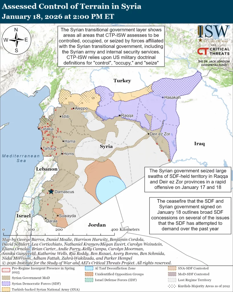The US-backed, Kurdish-dominated Syrian Democratic Forces (SDF) capitulated to the Syrian government in a ceasefire agreement on January 18.[1] The government compelled the SDF to agree after a combination of government operations and tribal uprisings caused the SDF to withdraw from nearly half of its territory and most of the heavily Arab areas.[2] The ceasefire agreement cedes all of Deir ez Zor and Raqqa provinces to the government, effective immediately.[3] Hasakah Province will integrate into the Syrian state over time.[4] The government will control the ISIS detention facilities and al Hol internally-displaced persons (IDP) camp, which holds many ISIS supporters.[5] The SDF will integrate its military forces into the Syrian Ministry of Defense as individuals — a major concession that SDF leaders have been refusing because it leaves Kurdish areas without a reliable defense force of their own.[6] Kobani will have a security force that is formed from the city’s residents.[7] This ceasefire represents a capitulation by the SDF, which has resisted these long-standing demands of the Syrian government.[8] This is a significant defeat for SDF moderates such as SDF commander Mazloum Abdi and civilian leader Ilham Ahmed, both of whom supported prior ceasefires in Aleppo but were thwarted by hardliners who were close to the PKK.