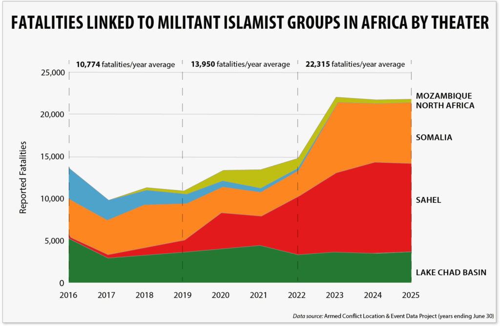 The 22,307 fatalities linked to militant Islamist groups in Africa over the past year sustain a record level of lethality observed since 2023 and represent a 60-percent increase from the 2020-2022 period.