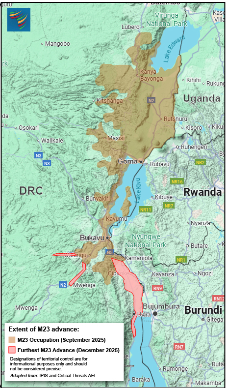 Fighting in and around Uvira is another potential trigger for the expansion of the conflict. Uvira is just across the border with Bujumbura, and an estimated 10,000 Burundian troops have been in the DRC to protect Uvira. M23 reportedly captured hundreds of Burundian troops during the December offensive. Clashes in this region could easily escalate into a conflict between Burundi and Rwanda.