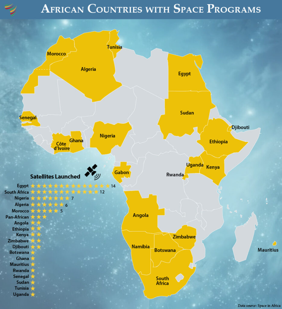 More than 21 African countries have established space programs, and 18 have launched at least one satellite. The continent has launched a combined total of 65 satellites (including miniature “CubeSats”), with over 120 additional satellites in development and expected to be launched by 2030.
