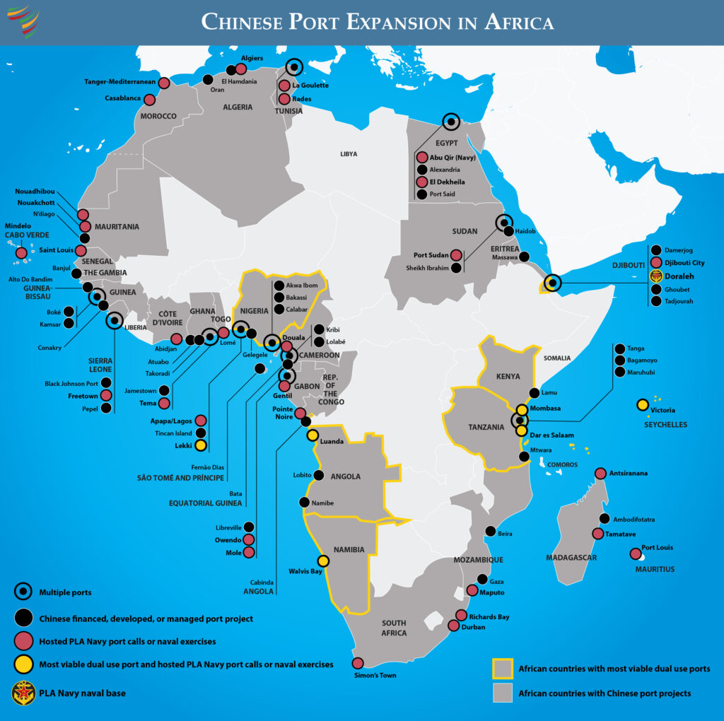Chinese state-owned firms are active stakeholders in an estimated 78 ports across 32 African countries as builders, financiers, or operators. Chinese firms are present in over a third of Africa’s maritime trade hubs—a significantly greater presence than anywhere else in the world. China’s expansive port development opens the door for China to repurpose commercial ports for military activities.