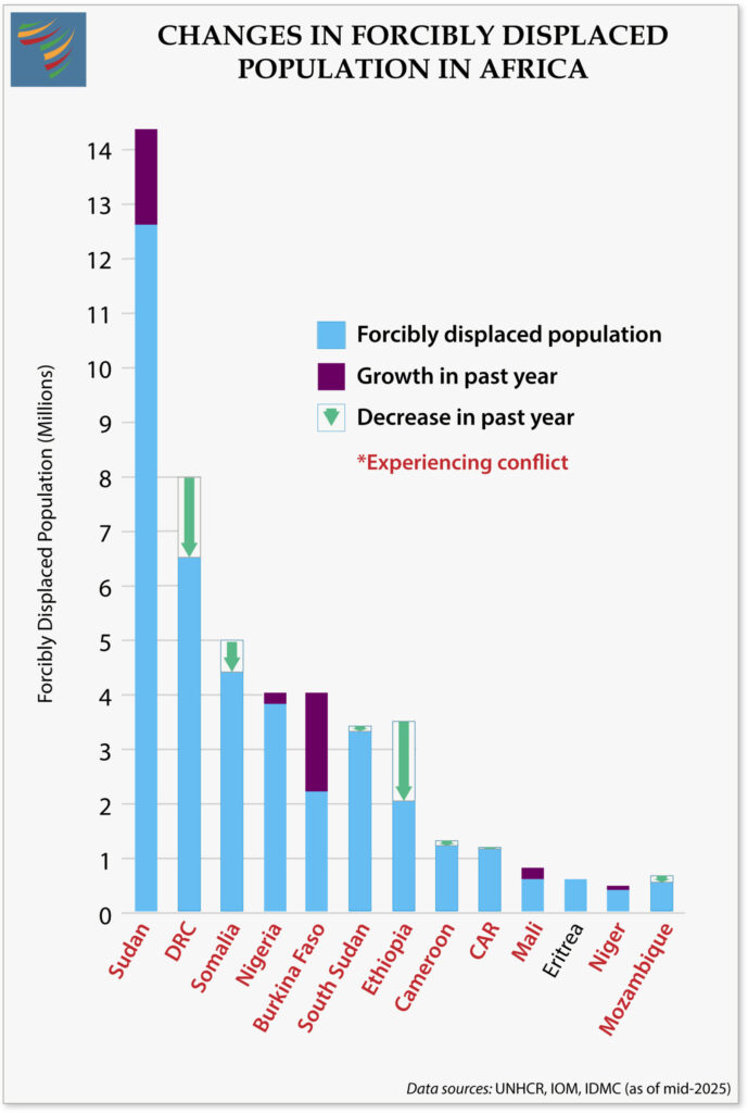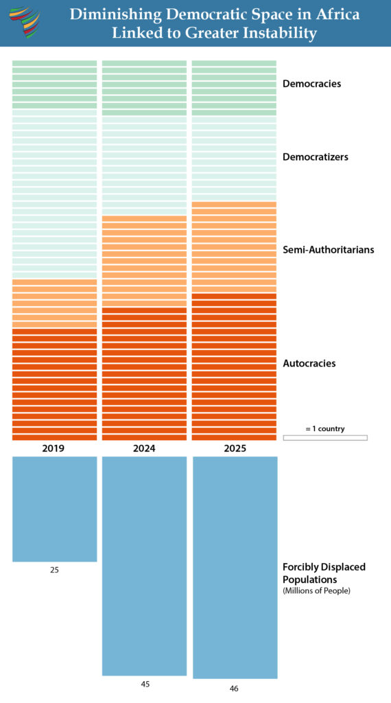 Building on this pattern, 14 of the 15 African countries with the largest forced displacement populations have authoritarian-leaning governments, underscoring the regional spillover effects from unrepresentative governance.