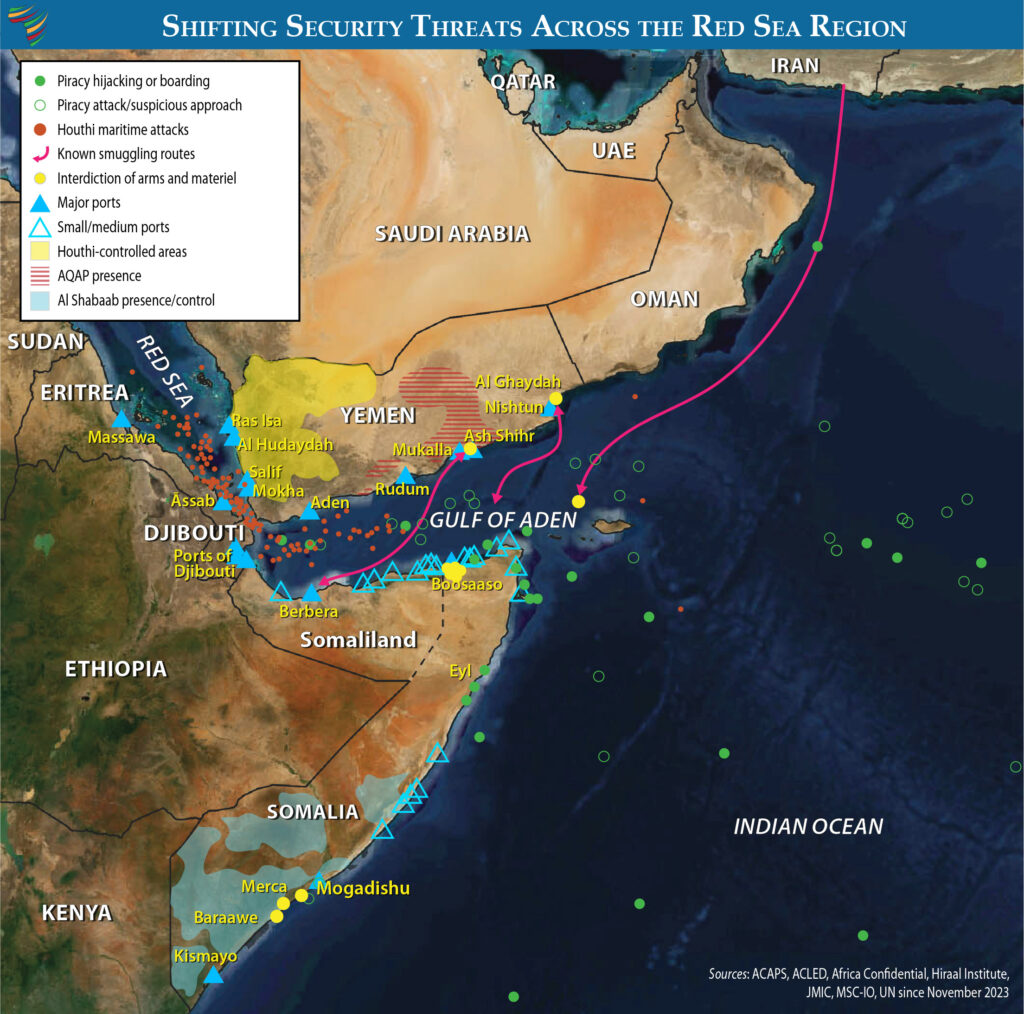 The rise in insecurity in the Red Sea, Gulf of Aden, and Western Indian Ocean has direct economic impacts on the global economy. Shipping through the Suez Canal (which accounts for about 12-15 percent of worldwide trade and 30 percent of container ship traffic) had dropped by 50-60 percent in the first half of the year.
