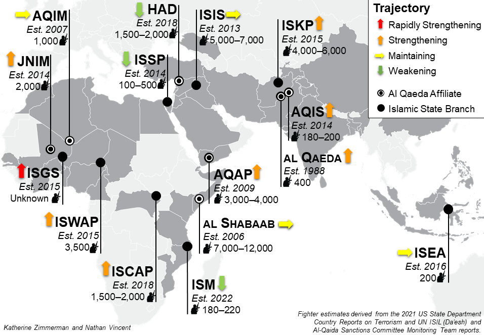 Note: The established date for each group is given in the figure with the abbreviation “Est.” The abbreviations shown are al Qaeda in the Arabian Peninsula (AQAP), al Qaeda in the Islamic Maghreb (AQIM), al Qaeda in the Indian Subcontinent (AQIS), Hurras al Din (HAD), Islamic State Central Africa Province (ISCAP), Islamic State East Asia (ISEA), Islamic State Sahel Province (ISGS), Islamic State Khorasan Province (ISKP), Islamic State Mozambique (ISM), Islamic State Sinai Province (ISSP), Islamic State West Africa Province (ISWAP), and Jama’at Nusrat al Islam wa al Muslimeen (JNIM). Note that ISGS was renamed “Islamic State Sahel Province” in March 2022. For clarity, ISGS will continue to refer to the Sahel Province while ISSP will refer to Islamic State Sinai Province.