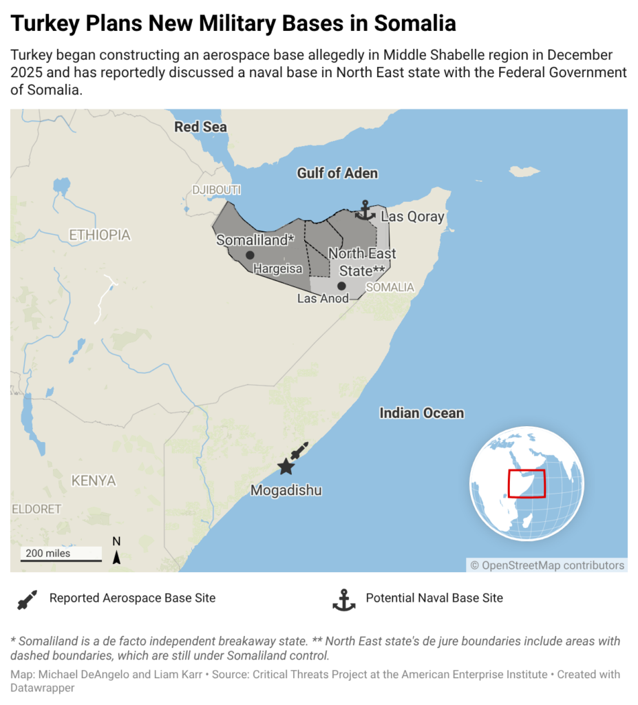 Turkey is bolstering its long-term military presence in Somalia through the deployment of advanced weaponry and exploration of new aerospace and naval bases. Turkey deployed F-16 fighter jets to Somalia for the first time in January 2026, with the aircraft performing a flyover during a Somali military commemoration on April 12.[6] Turkey also deployed tanks to Somalia in February to reportedly secure a planned Turkish aerospace base, which is intended for missile and satellite launches.[7] Turkey began construction on the base, which the Somali outlet Garowe Online reported is located just northeast of Mogadishu, with Somali approval in December.[8] Somalia and Turkey have reportedly come close to a separate deal for a Turkish naval base in North East state, with the United Kingdom-based, pro-Turkish outlet Middle East Eye reporting that the base may have been a discussion point during a January meeting between Mohamud and Turkish President Recep Tayyip Erdoğan, although CTP has not tracked further discussions in 2026.[9] Turkey supported the Federal Government of Somalia’s (FGS’s) inauguration of North East state in January despite a lack of consensus from Somali federal member states and the de facto independent Somaliland region disputing the claim.[10]